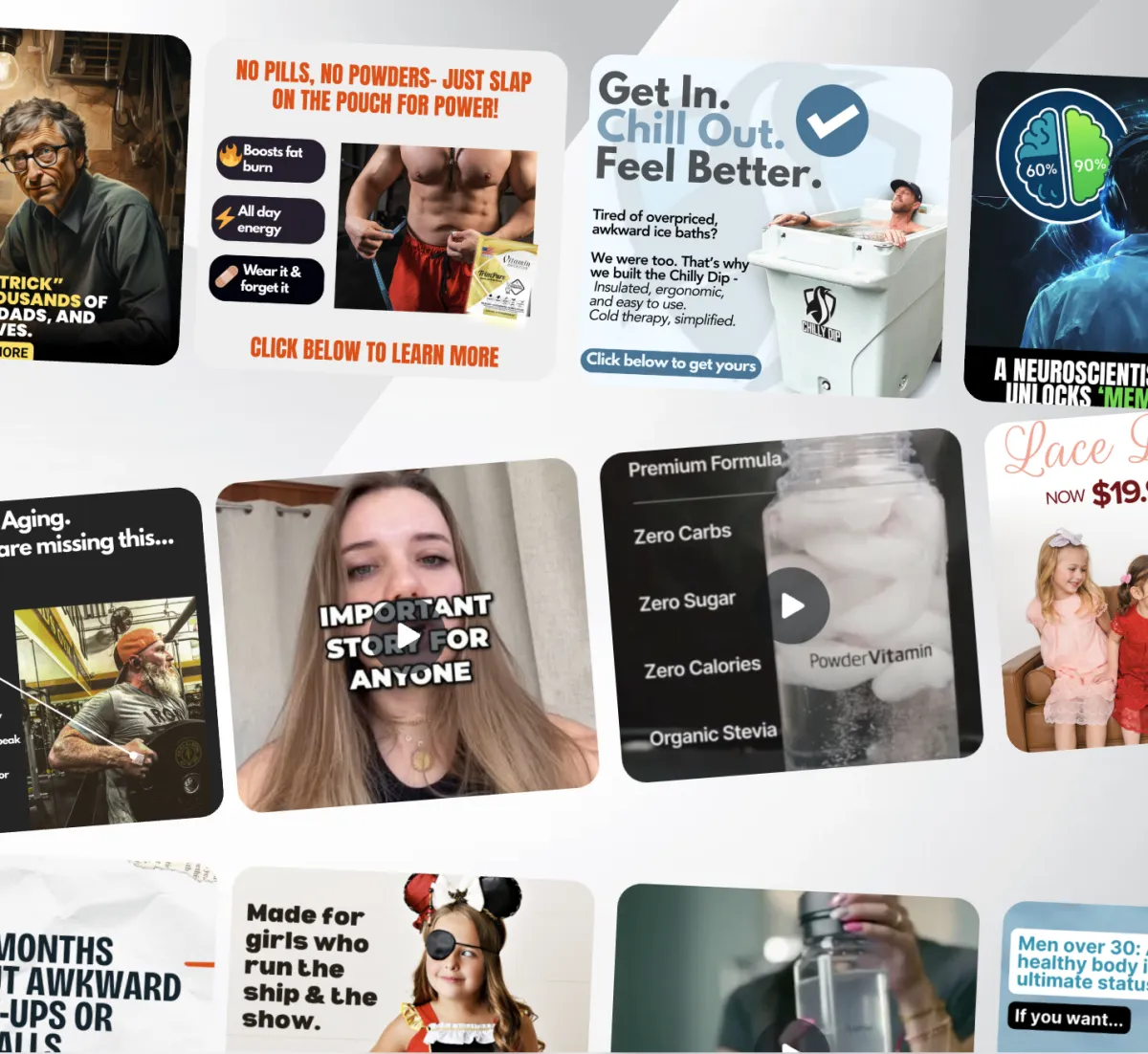 Access our library of over 100 high converting ad creative templates: From static images, memes, video ads, product mockups, UGC ads and more.